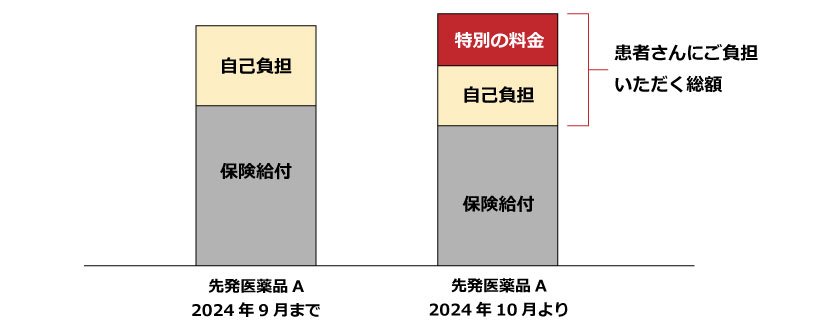 2024年10月より、ジェネリック医薬品(後発医薬品)がある薬に対して先発医薬品(長期収載品※)の使用を希望した場合、その薬の差額の4分の1とその消費税分を患者さまに「特別の料金」としてご負担いただく制度(長期収載品の処方等又は調剤に係る選定療養)が始まりました。