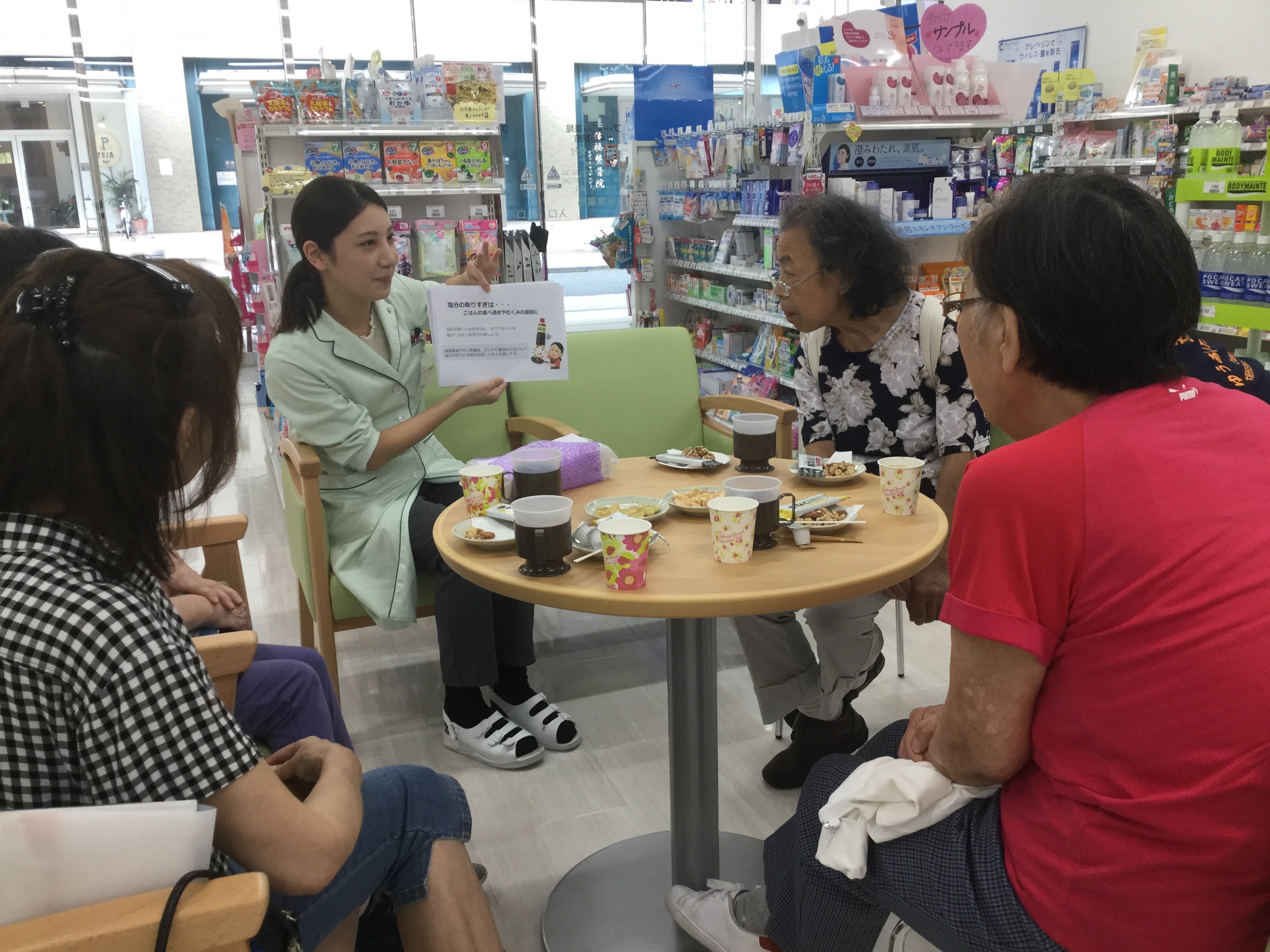 2019年4月から毎月1回、薬局内で『認知症カフェ』を開催しています。同カフェでは、薬剤師が、認知症に関することや、多くの高齢者の方が服用している薬剤についての情報をクイズ形式で出題するなどして、楽しく学んでいただきます。 薬剤師のみならず、当薬局に所属する管理栄養士による普段の食事のアドバイスや、メディカルパートナーが簡単にできる体操の指導をする時間も設けており、薬局スタッフが一丸となって取り組むイベントになっています。