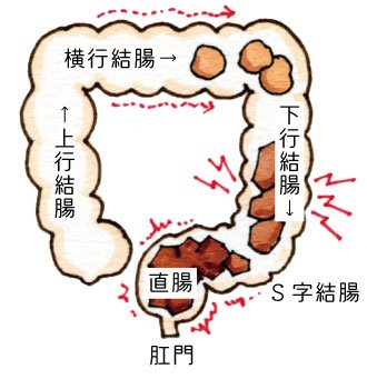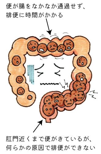 腸や肛門がうまく働かず、便が排出されるのに時間がかかることによって起こる便秘。